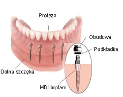 System miniimplantów zębowych MDI składa się z miniaturowych implantów tytanowych, które pełnią role korzenia zęba i osadzeń implantów, które łączą się z płytą protezy. W trakcie mocowania protezy, element panewki zatrzaskuje się na główce i utrzymuje protezę z pewną siłą.