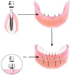 Wszczepienie implantów zębowych, które jest procesem łatwym i szybkim, przeprowadzane jest w gabinecie stomatologicznym z zastosowaniem znieczulenia miejscowego. Główki implantów wystają z tkanki dziąsłowej i tworzą mocną, solidną podstawę dla ustabilizowania protezy.